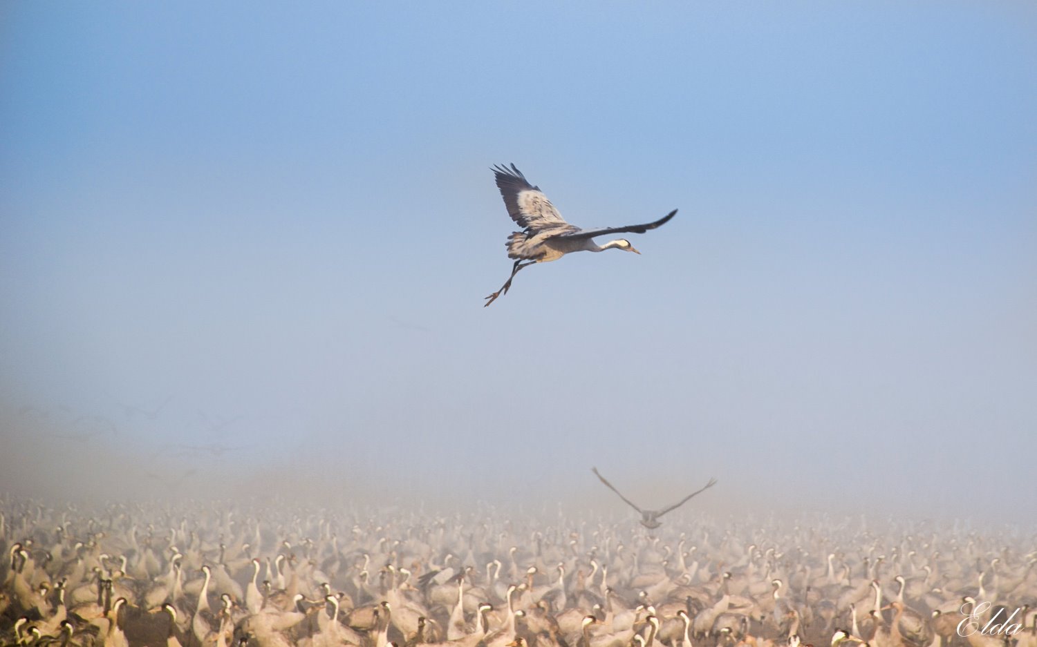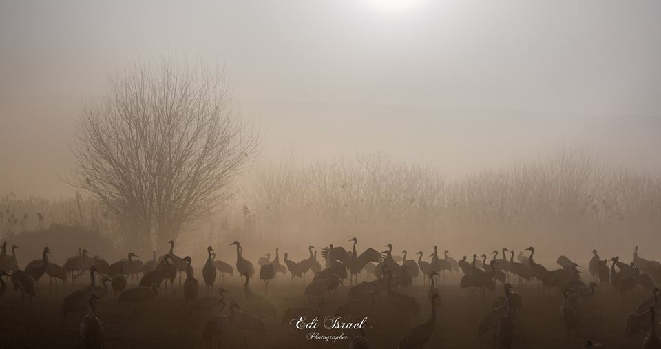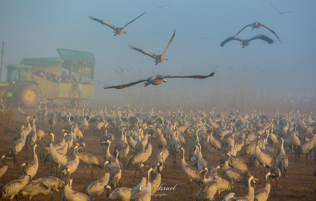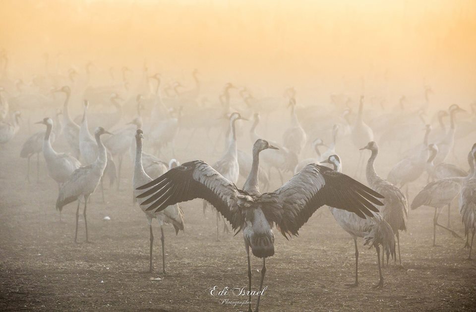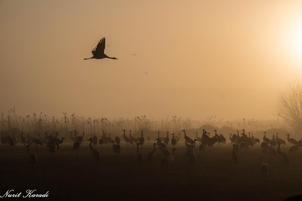 בעודנו נמצאים ב"עגלת המסתור" וקור חודר לעצמותינו שעת הדמדומים צופים על אגם מעלה אדים עם לחות גבוהה הערפל מתפזר לו אט אט, כולנו אוחזים במצלמות ומחכים לעגור שיעבור , לפתע נשמעים קולות לא ברורים כמו מאין צווחות הקול מתחיל להתחזק ומרגיש שהם ממש קרובים ממש כמו קונצרט צלילים שנשמע כל פעם מכיוון אחר. אווירה מסתורית וקסומה מתגלה והנה הם מתחילים להופיע תחילה בקבוצות קטנות ואז הם ממראים בשמי השמיים כמו מתוך הסדרה מרחפים מעלינו מדגמנים לכבודינו.