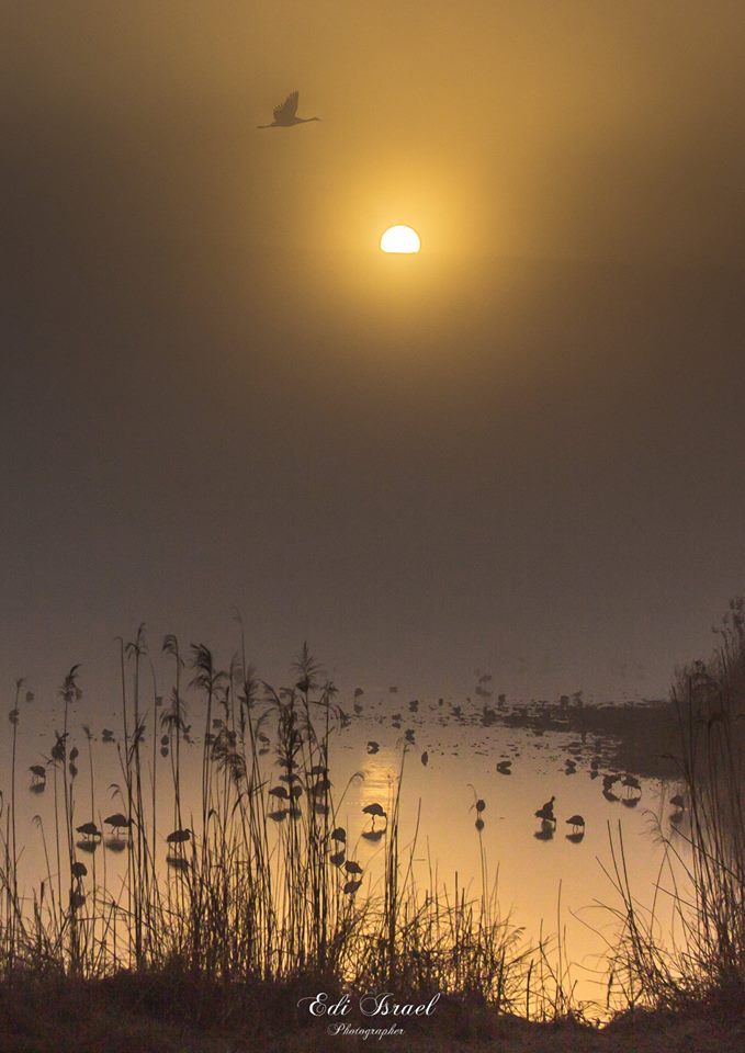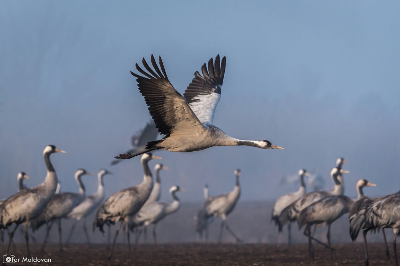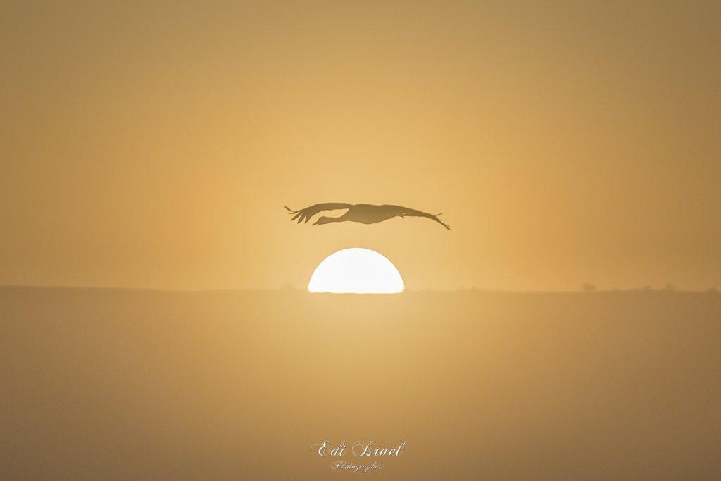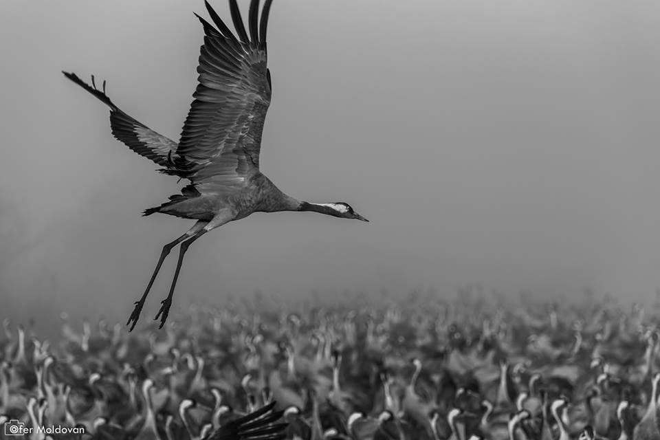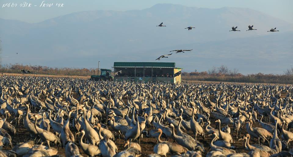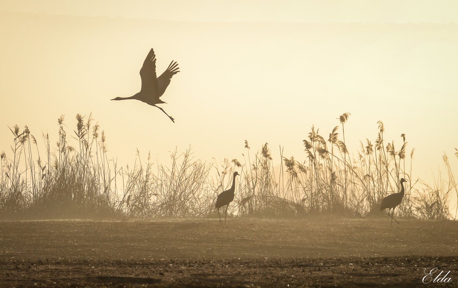 בעודנו נמצאים ב"עגלת המסתור" וקור חודר לעצמותינו שעת הדמדומים צופים על אגם מעלה אדים עם לחות גבוהה הערפל מתפזר לו אט אט, כולנו אוחזים במצלמות ומחכים לעגור שיעבור , לפתע נשמעים קולות לא ברורים כמו מאין צווחות הקול מתחיל להתחזק ומרגיש שהם ממש קרובים ממש כמו קונצרט צלילים שנשמע כל פעם מכיוון אחר. אווירה מסתורית וקסומה מתגלה והנה הם מתחילים להופיע תחילה בקבוצות קטנות ואז הם ממראים בשמי השמיים כמו מתוך הסדרה מרחפים מעלינו מדגמנים לכבודינו.