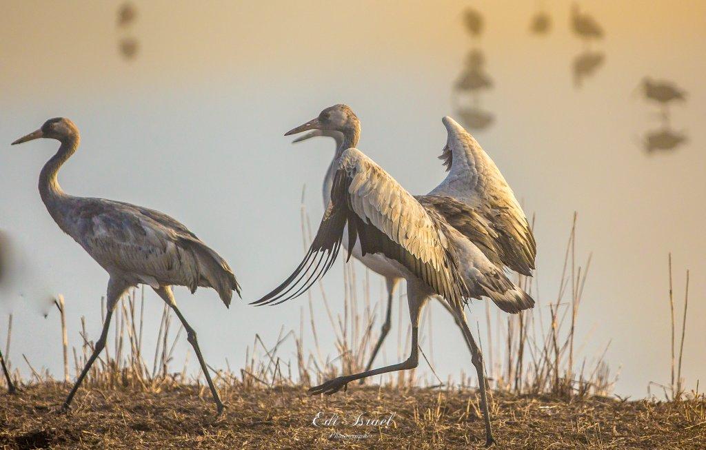 משנים זוית צילום ועוברים אל שטחי האכלה כשעגלת המסתור ממשיכה למצוא את דרכה ולאפשר לנו זוית צילום נוספת מתחילה השמש לבצבץ ומופיע קרן אור לפתע נגלה מראה מרהיב ביופיו , מרבדים אפורים של עגורים רוקדים במחול חיזור ומסמלים בדרכם את סמל האהבה. אווירה מסתורין, קסם הטבע וקסם הצילום .