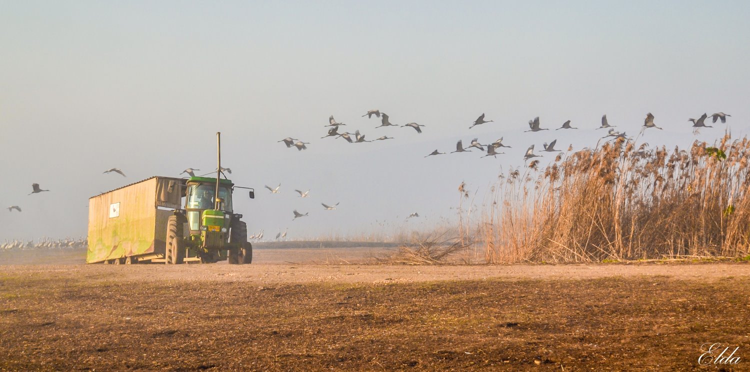 חמש לפנות בוקר עוד לא בקע אור ראשון 30 צלמים מתכנסים ב"עגלת מסתור" יוצאים אל היעד, צילום להקות עגורים, העגלה עוצרת מול האגם כולם מכוונים מצלמות ושום דבר לא נראה באופק, המדרי אליאל מסביר נספרו אתמול כ40,000 עגורים , מוסיף ואומר העגור הוא סמל האושר, התקווה, השלום והאהבה.