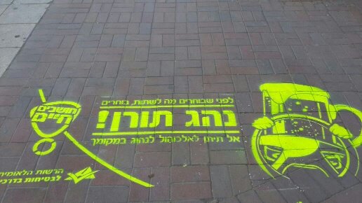 הקמפיין עלה בימים האחרונים באשקלון, בשיתוף הרשות הלאומית לבטיחות בדרכים, ובמסגרתו הוטבעו מסרים נגד נהיגה בשכרות על המדרכות עצמן, בסמוך למקומות הבילוי בעיר. בין המסרים, שהוטבעו בצבעים זוהרים ובולטים: "אל תיתן לאלכוהול לנהוג במקומך", "לפני שבוחרים מה לשתות, בוחרים נהג תורן" ועוד.