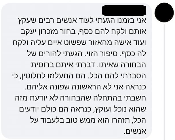 לדבריו, "המתחזה עקץ באשקלון 30 איש ובבאר שבע 20 איש! יש הרבה תגובות והכחשות לפוסט זה, העליתי כמה עובדות...לגבי "אשתו", אז היא משתפת איתו פעולה כרגע ועוזרת לו לעקוץ".