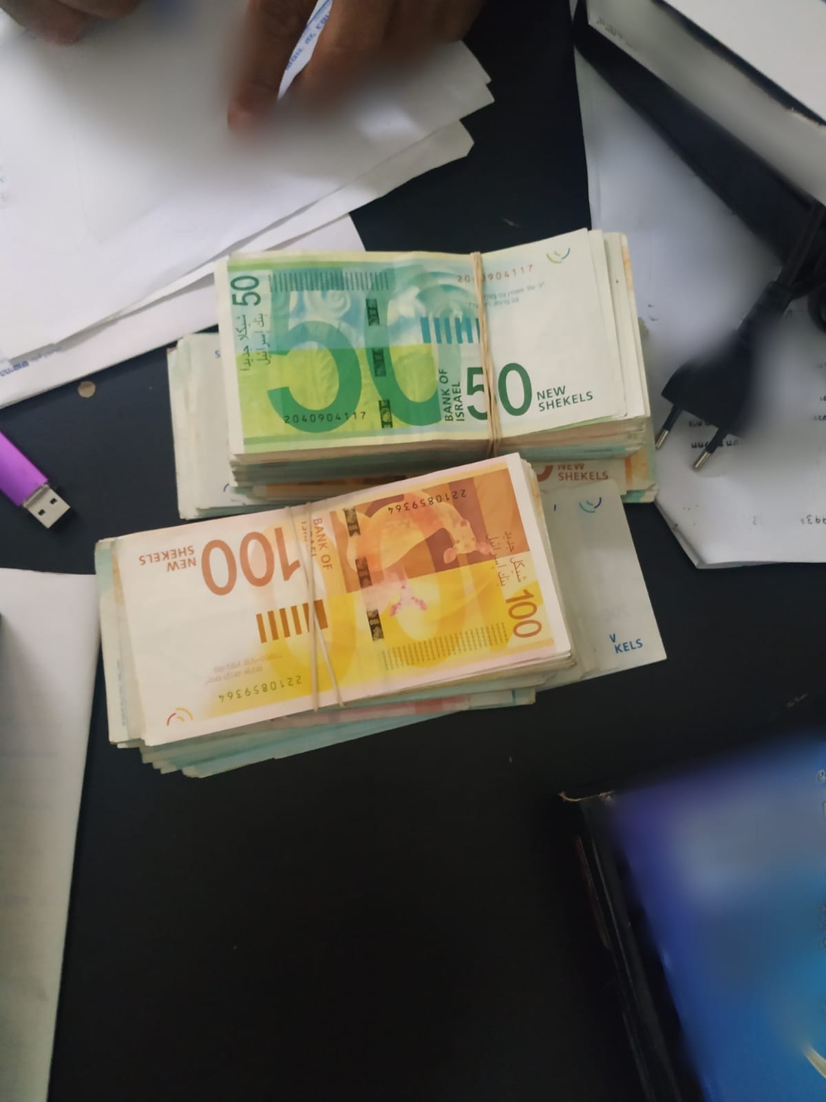 במהלך חיפוש ברכבם של החשודים נמצאו עשרות אלפי ₪ במזומן. בחיפוש בביתו של אחד החשודים נתפסו כת לאקדח, אזיקי ידיים, קורא כרטיסים, ציוד הלחמה, רחפן, טלפונים ומסמכים רבים.
