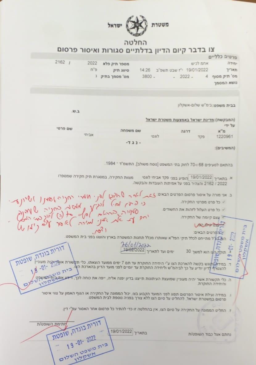 בית המשפט השלום באשקלון הטיל לבקשת המשטרה, צו איסור איסור על הפרשה המדוברת