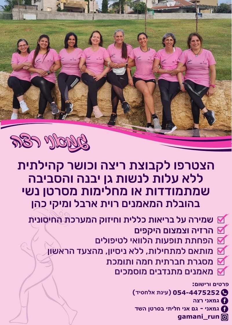 המיזם החברתי - ארצי של קבוצות ריצה חברתיות קהילתיות ללא עלות לנשים שמתמודדות או מחלימות מסרטן השד או סרטן נשי אחר (שחלות, רחם וצוואר הרחם), הפך לטרנד הבא כשאת הקבוצות מובילים מאמנות ומאמני ריצה וכושר מוסמכים, מתנדבים בכירים מהשורה הראשונה של אנשי המקצוע בישראל. גם בגן יבנה פועל המיזם ובנות הקבוצה המקומית, קוראות לכן, תושבות היישוב מתמודדות/מחלימות סרטן נשי, להצטרף אליהן