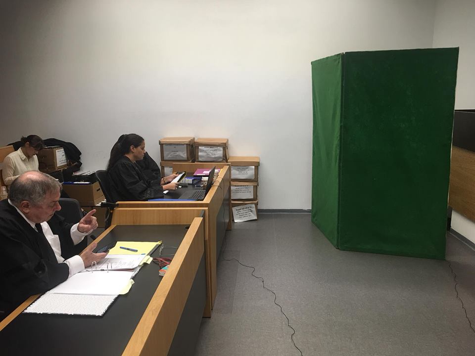 יש דיון בתוך האולם כאשר כל הנוכחים הוצאו מהאולם והשופטת נותרה עם אנשי הפרקליטות בלבד והעוקבים. הנושא דלתיים סגורות בעדותם.