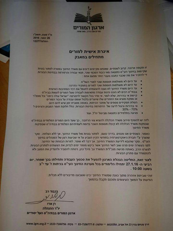 הלימודים בבתי הספר העל תיכוניים, יושבתו מחר עד השעה 10:00, כמחאה על חוסר טיפול בבעיות שהועלו בפני משרד החינוך, יו״ר ארגון המורים העל יסודיים, רן ארז אומר ״אנחנו נדברים עם שר החינוך ומנכלי״ת משרדו כבר כמעט שנה ומעלים בעיות שונות והם אינם מתייחסים. אנו נפתח בשביתה כללית אם לא ימצא פתרון לבעיות״