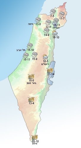| היום: גשמים לפרקים ירדו בצפון, ובמהרה יתפשטו למרכז ובהמשך לצפון הנגב. בחרמון ירד שלג. ינשבו רוחות חזקות ובדרום הארץ יהיה אביך. אף במרכז ייתכן אובך. הטמפרטורות ירדו במידה ניכרת. משעות אחה"צ יתחוללו סופות רעמים יחידות וקיים חשש משטפונות והצפות. הלילה: ממטרים לפרקים מלווים בסופות רעמים יחידות ירדו מהצפון ועד לצפון הנגב. שלג יוסיף לרדת בחרמון. יוסיפו לנשב רוחות חזקות וקיים חשש כבד משטפונות והצפות במקומות המועדים. |