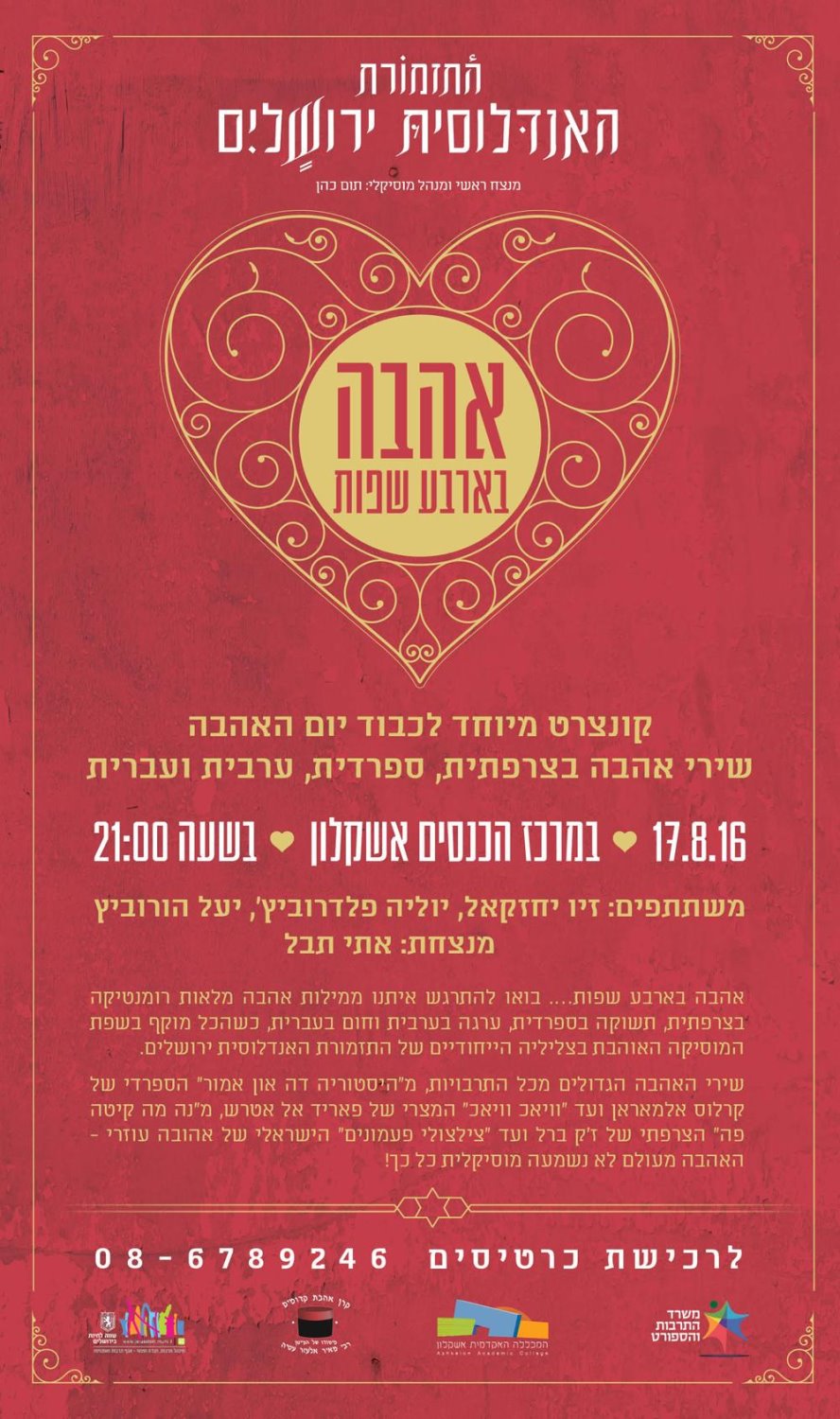 קונצרט חגיגי לכבוד יום האהבה של התזמורת האנדלוסית ירושלים, יערך ב - 17/08/16 במרכז הכנסים במכללה האקדמית אשקלון