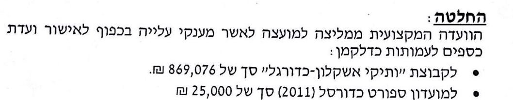 סיוע לקשישים ומתקני שעשועים לילדים נגישים, אולי חשובים אבל לא למקבלי ההחלטות בעיריית אשקלון, הגם שגורמי המקצוע מעריכים אותם. ועדת התמיכות בעיריית אשקלון החליטה לדחות פה אחד בקשות של עמותות אלו אולם לאשר פה אחד 869 אלף ש״ח עבור הבייבי של, איתמר שמעוני, ועוד 25 אלף ש״ח כחלק מהבטחה פוליטית. כך נקבעים סידרי העדיפויות בעיר. ועדת התמיכות בעירית אשקלון מונה בין היתר את חבר המועצה אברהם עשור, מנכ״ל העיריה חיים סופר, גזברית העיריה נחמה שריקי והילה רווח היועמש״ית בעירית אשקלון. במושב הועדה שהתקיים השבוע נידונו מספר נושאים חשובים על הפרק. מבחינת נושאי הוועדה, מסתמן כי חבריה מיישרים קו עם שמעוני וכי תקציבי הכדורגל מקבלים עדיפות עליונה על כל נושא אחר. גם שיקולים פוליטיים זרים נטמעו בה. עמותת עמדא - העמותה תומכת בפרוייקטים של אגף הרווחה בתחום הזיקנה וביקשה תמיכה מעיריית אשקלון. ממחלקת אשכול לקשיש ציינו את העמותה לטובה, ״עבודתם משמעותית ביותר וכי חשוב מאוד לשמור על יחסי עבודה תקינים עם העמותה שכן ישנם פרוייקטים חשובים עבור אוכלוסייה זו״ כתבו במחלקה. למרות השבחים שקיבלה העמותה, החליטו בועדת התמיכות לדחות את בקשתם לאור אילוצי תקציב של העירייה ואף הגדילו ופסקו כי העמותה לא תקבל תמיכה שכן היא נמצאת בעודף כספי. עמותת קו לחיים - העמותה עוסקת בבניית גני שעשועים נגישים ואף השקיע השנה האחרונה באשקלון ובבאר שבע כ-400 אלף ש״ח בבניית גנים אלו. העמותה ביקשה תמיכה לצורך קידום פרוייקטים חדשים בעיר אולם נדחתה מאותה סיבה: ״לאור אילוצי תקציב העירייה ומצבה של העמותה הוועדה לא מאשרת תמיכה״. עמותה לחינוך וספורט הישגי באשקלון - הפעם, הגדילו בוועדה וציינו ליד שם העמותה את שם המבקש: מני יאסו. רבות נכתב על הנושא הזה אולם למרות החלטת מועצה בעיניין העמותה וההודעה של יאסו כי הוא מוכן לשלם 10% לעמותה עבור השימוש באיצטדיון, הוחלט כי יוקם צוות בדיקה שיעביר את ממצאיו למועצת עיריית אשקלון שתכריע. מענק עלייה - הפועל אשקלון: כאן כבר מדובר בבייבי של ראש העיר. קבוצת כדורגל כושלת, עם מאמן שמרוויח מאות אלפי שקלים בשנה מכספי הציבור והנהלה שמורכבת בעיקר מקליקת חברים, ללא רוב של שחקני בית ואלו שכבר רשומים בקבוצה משחקים רוב הזמן על הספסל, ולמרות כל זאת הוחלט ע״י ועדת התמיכות להעביר לעמותה סך של 869,076 ש״ח. עבור מה? לשמעוני הפתרונים. 10% מהסכום הזה יכל לתקצב יותר מעשר עמותות שתומכות בזקנים, ילדים בעלי מוגבלויות, נזקקים, תלמידים ועוד רבים אחרים. כנראה שחשוב יותר לעיריית אשקלון לתחזק את מאמן הקבוצה יובל נעים ועלויות השכר האדירות שלו על-חשבון עמותות כאלו או אחרות. אם לא דיי בכך, נראה כי העזיבה של יוסי כהן את משה אטיאס והסולחה בין ראש העיריה לדוד יפרח אכן מתחילות להניב מבחינתם פירות, שוב, על חשבון הציבור ובמקום לעמותות סיוע. מועדון ספורט כדורסל, יקבל לראשונה מזה כשנתיים, תקציב של 25,000 ש״ח. מה עומד מאחורי תקציב זה? נראה כי הבטחות פוליטיות כאלו או אחרות פתחו את הדרך למועדון הכדורסל.