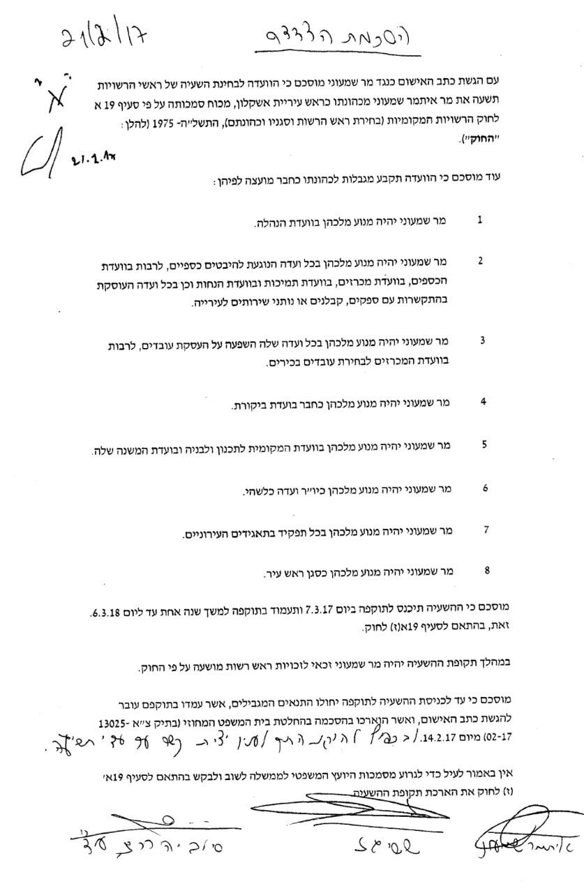 איתמר שמעוני, יורחק מכל פעילות ציבורית באשקלון. כך החליטה הועדה שהוקמה על פי בקשת היועץ המשפטי לממשלה
