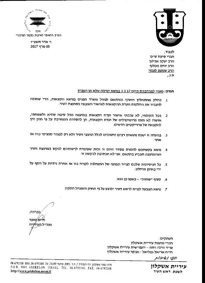 הסעיף של אישור הקצאות הקרקעות שדיווח עליהן אתמול בכתבה שכותרתה הצביעה על ניסיון להקצות קרקעות לסיעות החרדיות וכתוצאה מכך, הוציאה סיעת ש״ס את מכתבה למנכ״ל העירייה, חיים סופר, שבו הם ביקשו להסיר את ההצעה מסדר היום, שכן הם לא ביקשו כלל הקצאת שטח, דבר שעלול היה להתפרש כשוחד בחירות. מנכ״ל העירייה שהחל לטפוח לעצמו על השכם, כתב מכתב תשובה לחברי מועצת העיר מטעם ש״ס. בין הייתר אמורה המועצה לדון בסעיף ״שונות״ מה שאומר שיש כוונה לבצע מהלך מסריח מהראש של בחירת ממלא מקום לראש העיר, מה שאסור להעשות בסעיף מהסוג הזה, שכן מדובר בדבר מהותי ולא שולי כפי שאומר החוק. מקורבים לקומה הרביעית אומרים שהיועצת המשפטית, הילה רווח, מתנגדת למהלך ולצורך קבלת הלגיטימציה נרכשו שרותיו של עורך דין חיצוני שיכשיר את השרץ והמחטף יהפך לכשר. מצורף מכתבו של סופר:
