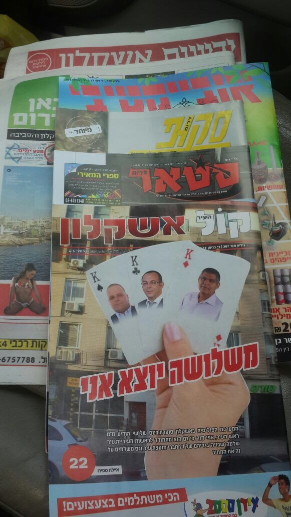 5. 'קול העיר אשקלון' עמודים 14 ו 15 הטור השבועי של יצחק קאפח.. אפשר לקרוא... עמוד 16 תלמידי בית ספר מקיף עירוני א' באשקלון לא שוברים מסורת. השבוע קיימו הפנינג קיימות... שאפו....עמודים 22 ו 23 סיקור של המפה הפוליטית בעיר... אפי מור מתמודד ללא תמיכתו של שמעוני שבגד בו... המועמד המוביל לנצחון הוא הרב אביטן!!! לאב אביטן אין מחלוקת עם אף חבר מועצה הוא אמון על כולם והוא היחידי גם שיכול לגשר וליצור את החיבור בין כולם ולכן הוא זה שיהיה ראש העיר!! עמוד 26 קומוניקט על 300 ק"ג בשר שאינו ראוי למאכל שהושמד על ידי השירות הווטרינרי העירוני... מקומון לייט עם מגמה משתנה וציון עובר.