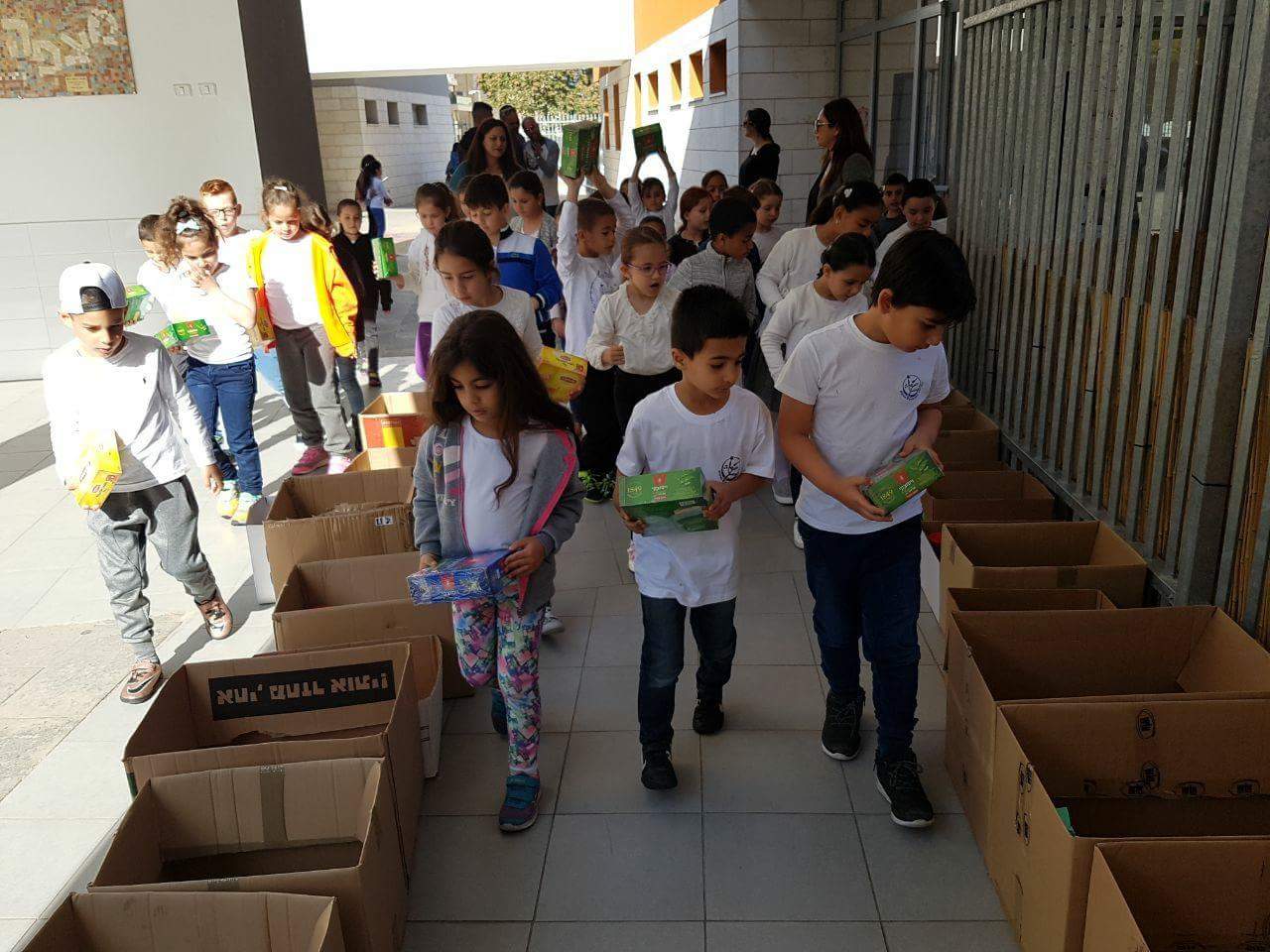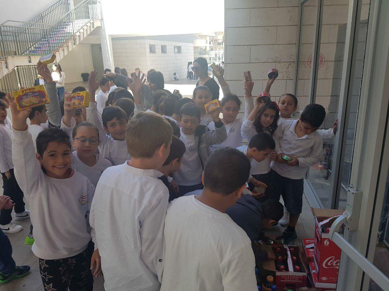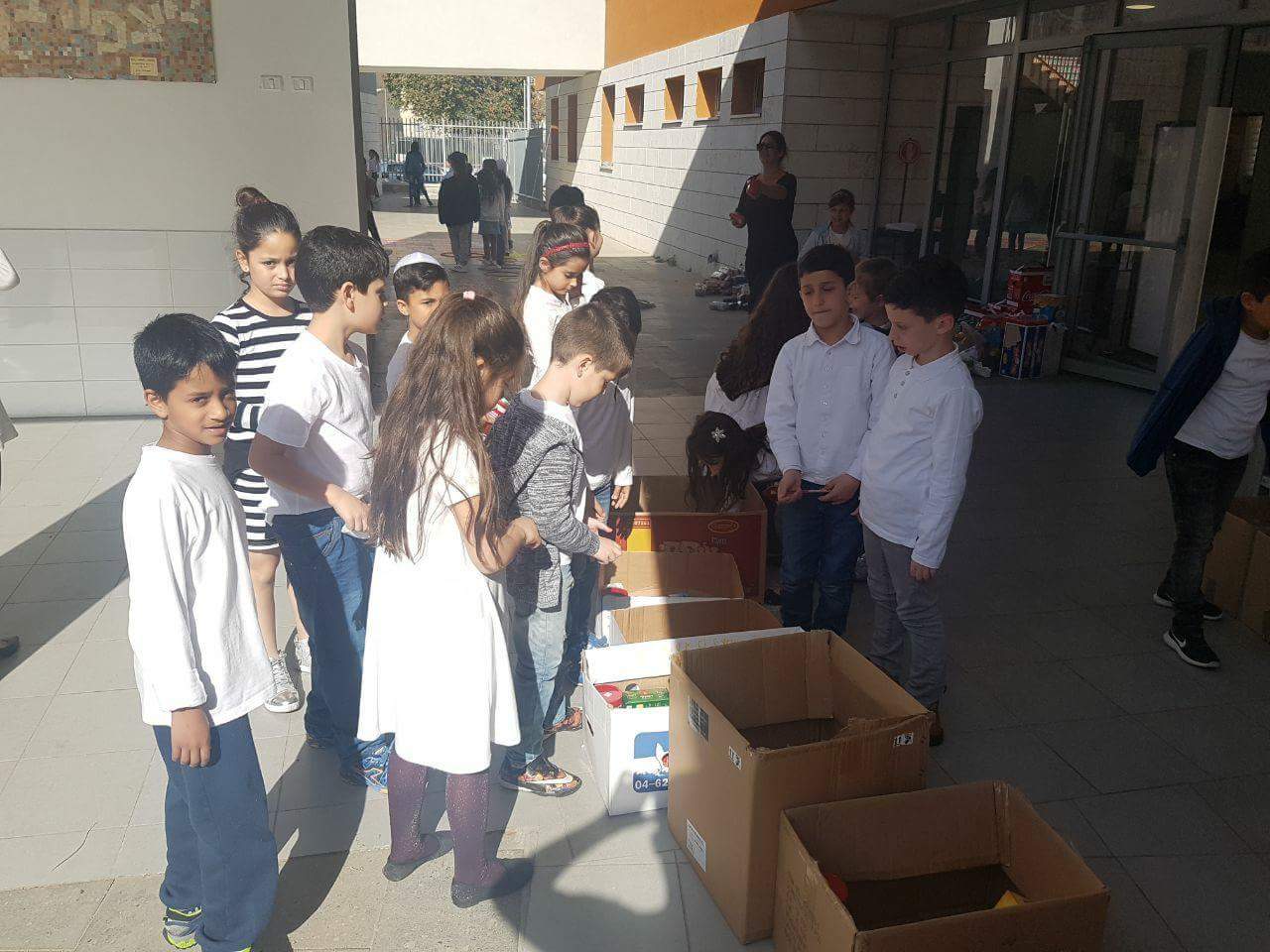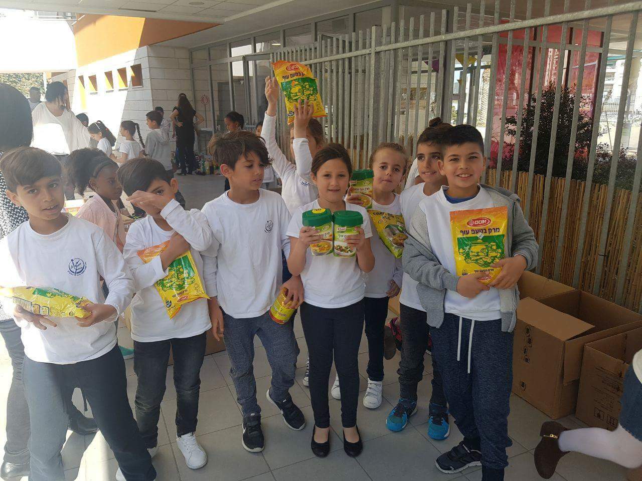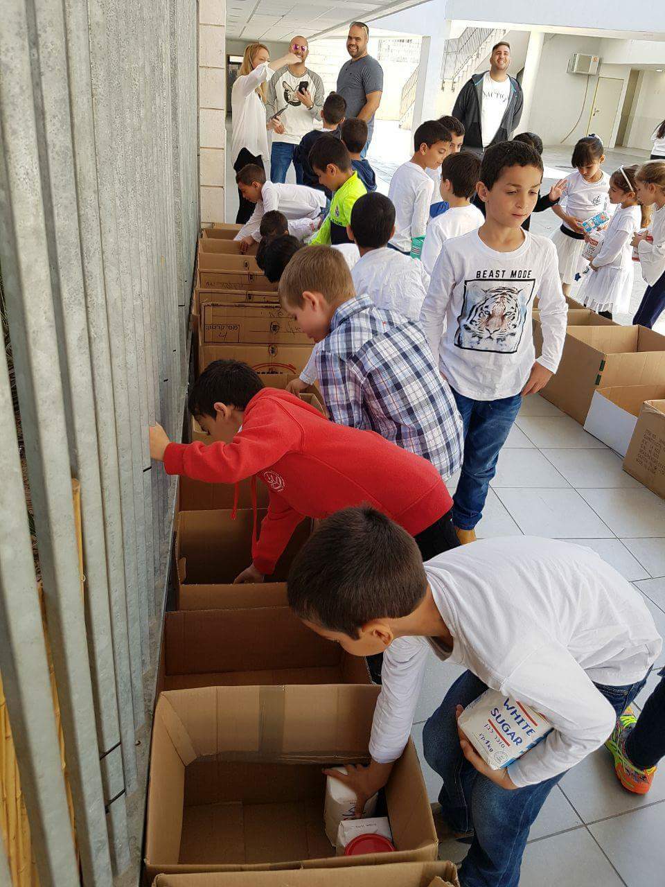 ילדי בית הספר אספו מוצרים והכינו חבילות כדי להעביר אותם למשפחות.