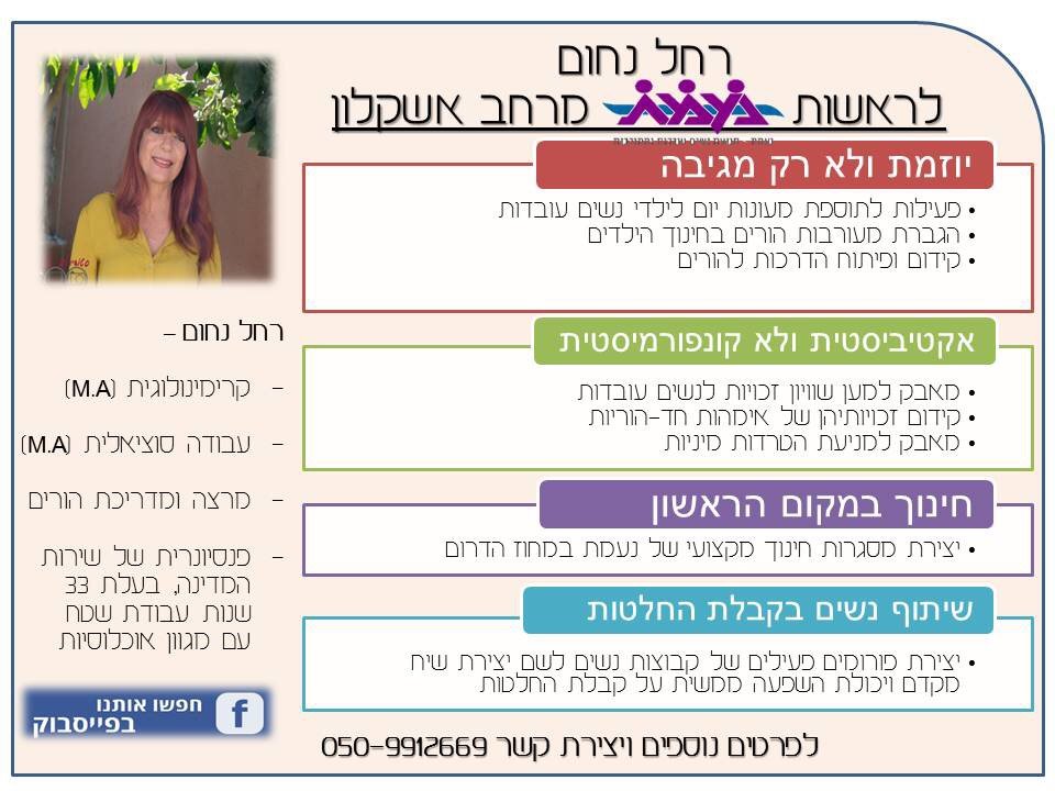היא נציגתה במרחב של שלי יחימוביץ, שמתמודדות על ראשות ההסתדרות. רחל נחום, תושבת אשקלון, קצינת מבחן וחוקרת ילדים בדימוס וכיום מרצה בתחומי ילדים ונוער ומדריכת סדנאות הורים. נחום, שבדומה ליחימוביץ׳, מביאה בשורה של שינוי, חדשנות בעשייה וצמיחה בהיקפי הפעילות. במסגרת הרוח החדשה, שלי יחימוביץ', להפיח בשורות ההסתדרות הכללית ומתוך רצון להרחיב את הפעילות למגוון קהלים, הודיעה שלי כי היא תומכת ברחל נחום כמועמדת מטעמה לתפקיד יושבת הראש של סניף נעמת מרחב אשקלון. רחל, תושבת אשקלון, בעלת תואר שני בעבודה סוציאלית וקרימינולוגיה, פעלה ונגעה בציבורים רבים במהלך שנות עבודתה ופעילותה המקצועית, במתן שירות, סיוע ותמיכה. כיום, מלבד פעילותה כמרצה ומנחת הורים, מובילה פרויקט מנהיגות צעירה מטעם מועדון רוטרי, פרויקט אשר מטרתו קידום דור צעיר של מנהיגות ערכית ובעלת תחושת אחריות ומחויבות לחברה. רחל החליטה כי גם לאחר פרישתה מהשירות הציבורית היא לוקחת על עצמה להמשיך בפעילות ועשייה תורמת לחברה, ונוטלת על שכמה את קידום וריענון הפעילות למען הנשים באזורנו. רחל מסבירה: "להתמודדות על תפקיד יו"ר מרחב אשקלון בנעמת אני מגיעה לאחר שנים של פעילות עם קהל אנושי מגוון. אני רואה חשיבות רבה בתפקיד זה כדי לאפשר יישום של הערכים והלקחים שהפנמתי במהלך שנות עבודתי עם נשים, ילדים ובני נוער. לתפקיד זה יכולת השפעה לטובה וכינון מעורבות התורמת לצמיחה בחייהם של רבים. בעיניי המפתח להצלחה בתפקיד תלוי במידת המחויבות האישית לעשייה והאחריות לקדם את איכות חייהן של נשות ישראל – ולי יש מחויבות מלאה לנושא! נעמת, תנועת הנשים הגדולה בישראל, הוא ארגון שמטרותיו לקדם את מעמד האישה בישראל, ולהביא לשינוי המדיניות החברתית לקראת השגת שוויון בין המינים במשפחה, בעבודה, בחברה ובכלכלה. סניף מרחב אשקלון של הארגון מעניק שירותים לישובים אשקלון, קריית-גת, שדרות, והמועצות האזוריות חוף אשקלון ולכיש. רחל מודיעה כי היא תשים בראש סדר העדיפות שלה טיפול וקידם הנושא של זכויות נשים בעבודה, מניעת אלימות נגד נשים, פיתוח וקידום הרחבת המסגרות של מעונות היום באזורנו ועוד רבות.