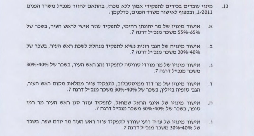 מי שהיו עוזריו של ראש העיר המושעה, איתמר שמעוני, רועי שוורץ והראל שמואל, יהפכו להיות מזכירותיהם של רמי סופר ויורם שפר, הסגנים החדשים, בשכר של כ - כ-15 אלף שקלים לחודש, כך החליט ממלא מקום ראש העיר, תומר גלאם, על פי ההסכם בינו לבין איתמר שמעוני. בהסכם, שעדיין לא הוצג לציבור על פי החוק, יש גם את המשך פעילותו של המנכ"ל חיים סופר, שגלאם לפחות מחוייב לאחד מחברי המועצה שנמצא איתו בקואליציה, לפטר אותו חודש לאחר המינוי שלו, כמחליפו של שמעוני.