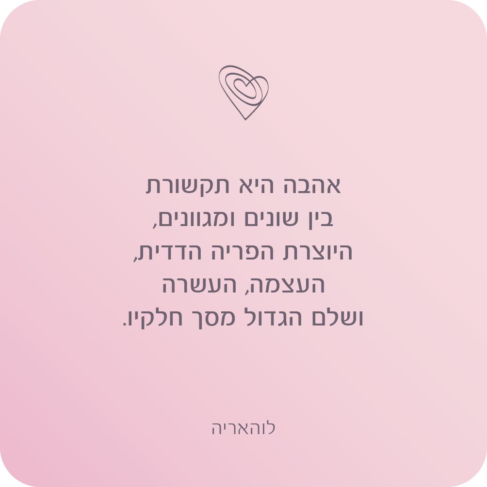 ניתן לרכוש באתר של לוהאריה את ערכת "מילים של אהבה" שאני אוהבת במיוחד, ליום-יום וגם ליום חג. הערכה מחולקת למסרים, המלצות והיגדים לביסוס והעמקת האהבה בתוכנו ובסביבתנו.
