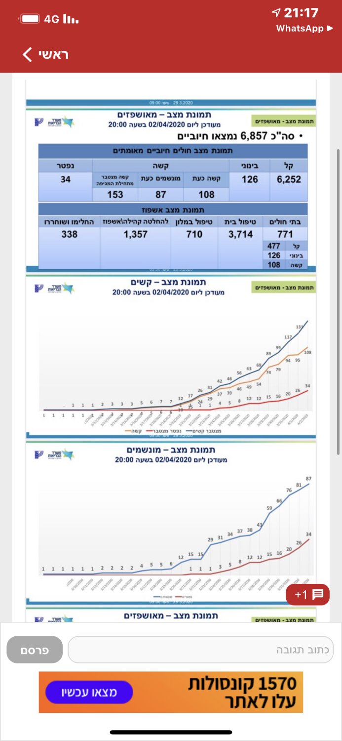 עדכון מצב ליום חמישי בשעה 21:30. בישראל יש 6,857 חולים, 34 מתים.