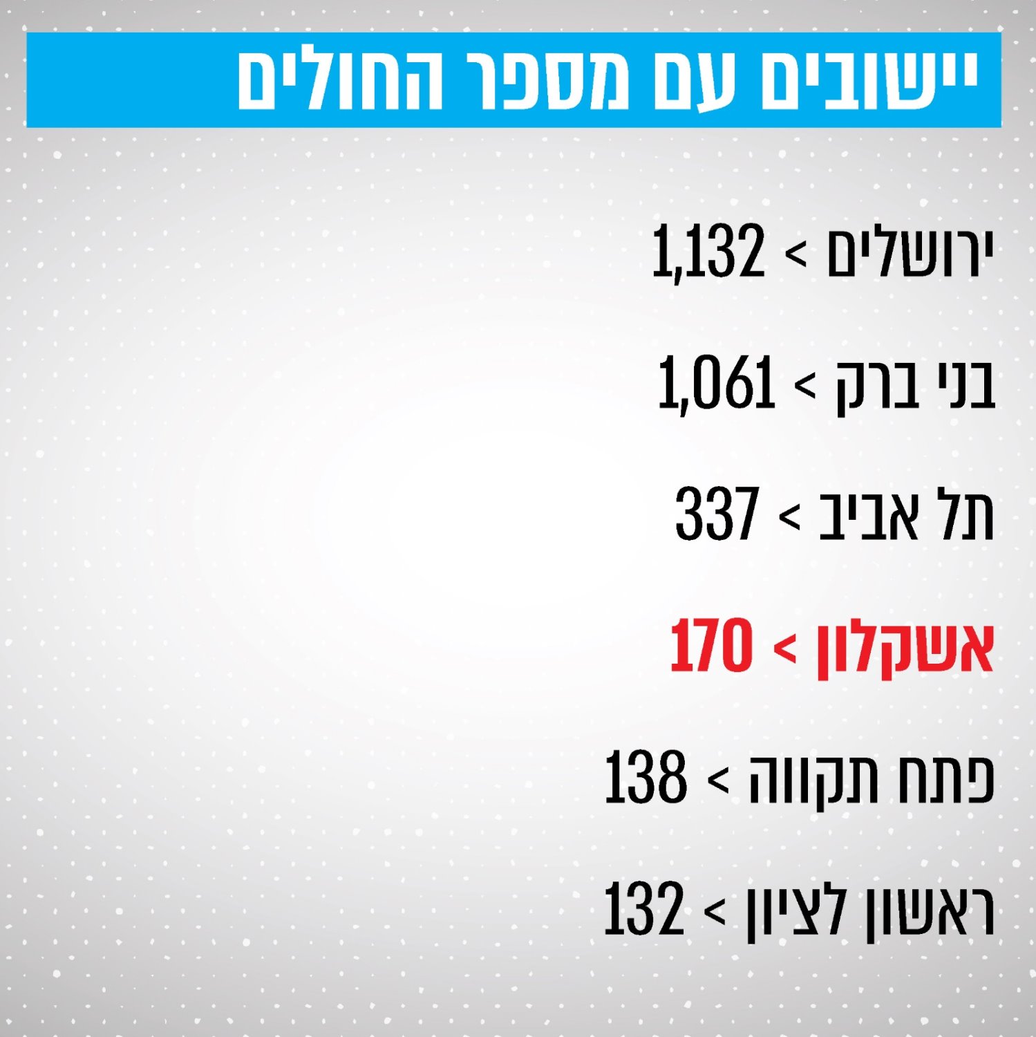 עם המספר הזה, העיר אשקלון במקום הרביעי בארץ. ראש העיר יצא בקריאה לתושבים להקשיב להוראות משרד הבריאות
