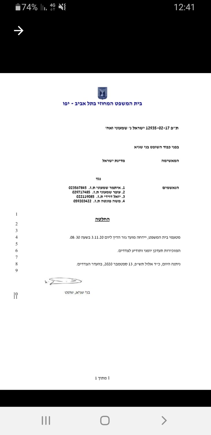 שופט בית המשפט המחוזי בתל אביב, בני שגיא, שאמור לגזור את דינו של ראש העיר לשעבר, איתמר שמעוני, שמואשם בהפרת אמונים, הלבנת הון ושוחד, החליט בעקבות המצב לדחות את מתן גזר הדין ל -3/11/20 השופט שגיא כותב בהחלטתו שמטעמי בית המשפט הדיון ידחה.