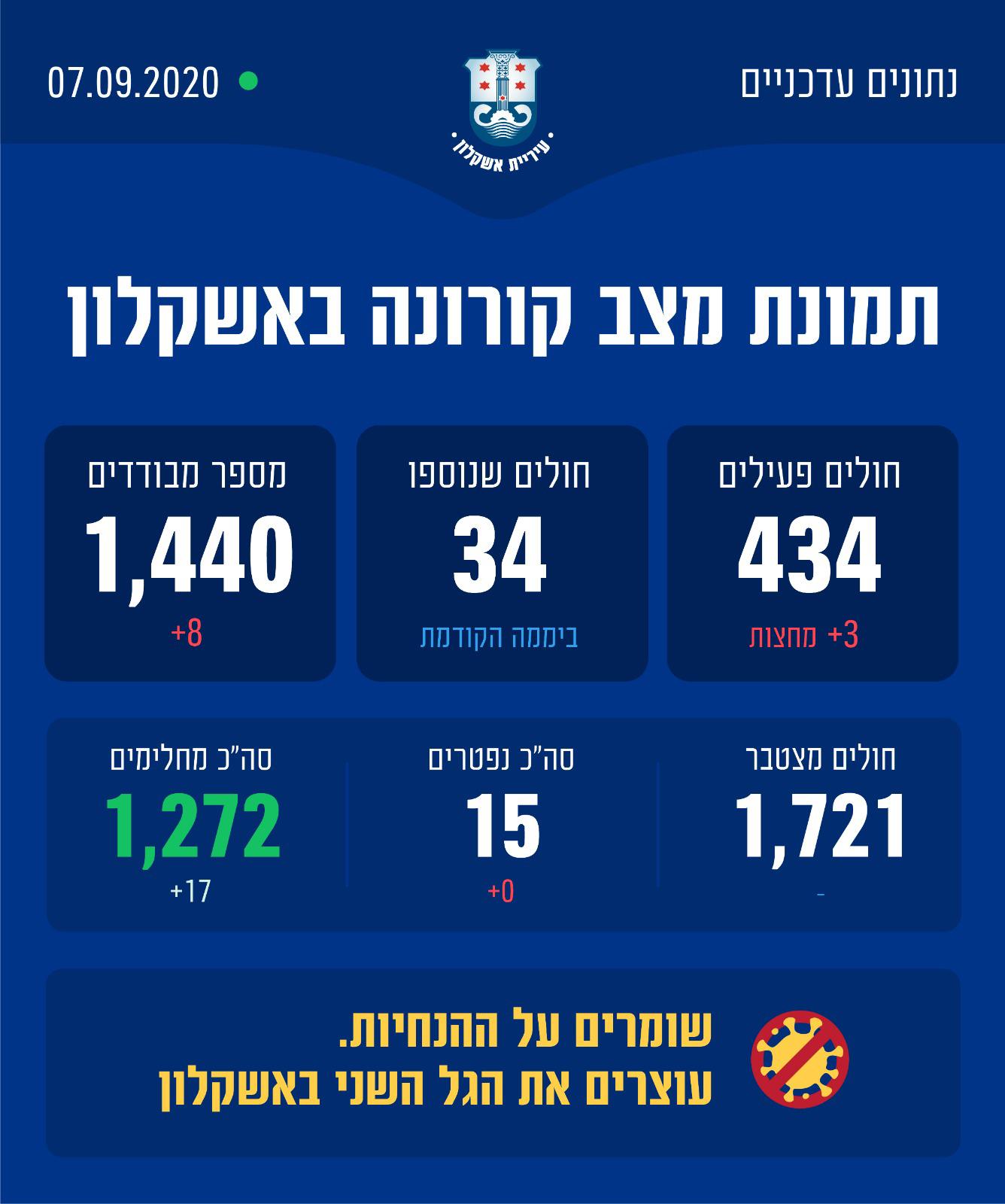 תמונת מצב מעודכנת באשקלון נכון לשעה זו > שימו לב, קיימת עלייה במספר החולים החדשים בכל רחבי הארץ וגם באשקלון נוספו 34 חולים חדשים ביממה האחרונה.