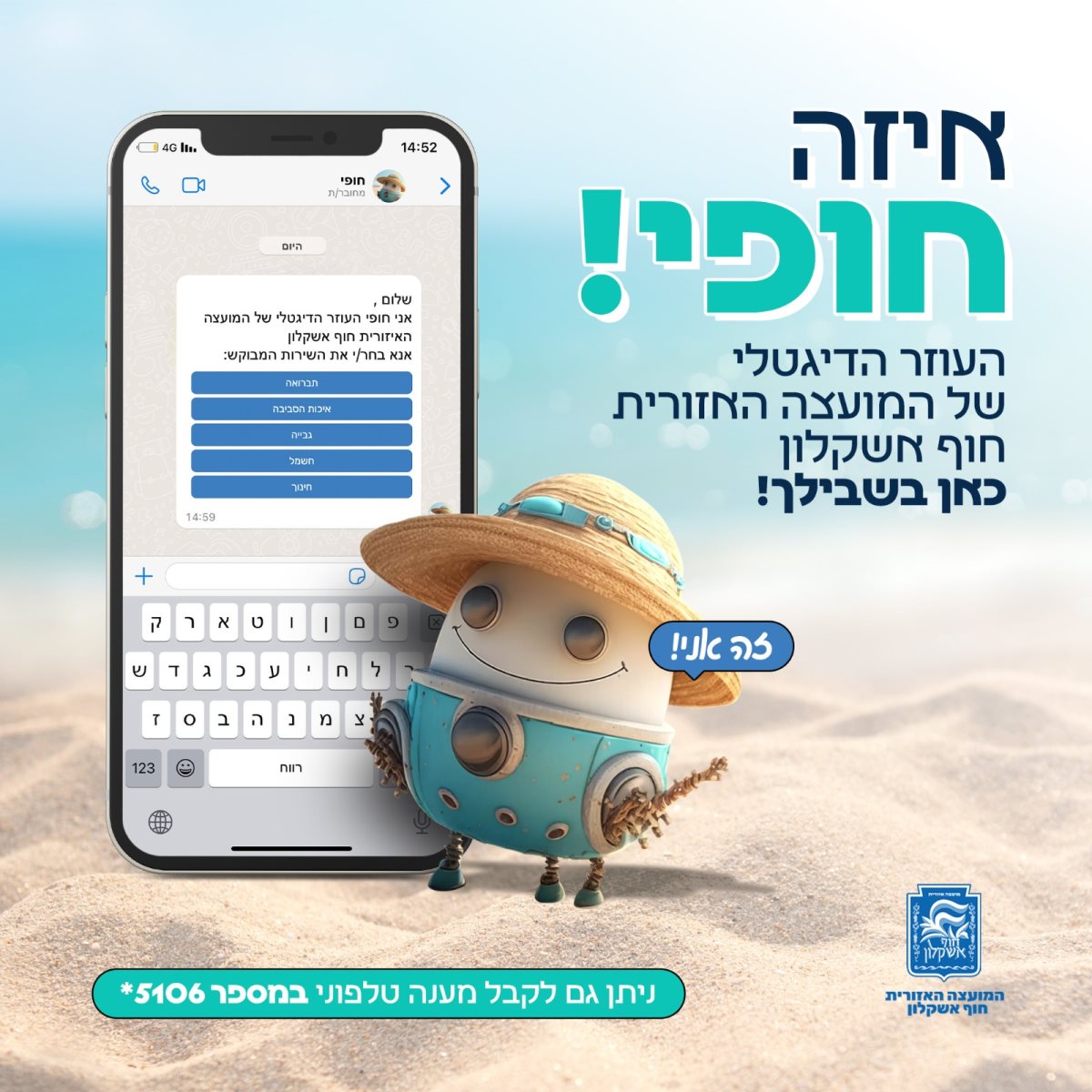 "חופי - העוזר הדיגיטלי שלך", הוא שירות דיגיטלי באתר המועצה ובאפליקציית הוואטספ, והפניה לשירות המבוקש ללא המתנה לנציג וללא עיכובים. ברגע פתיחת פנייה בשיחת וואטספ עם חופי, הפנייה נשלחת ישירות למחלקה הרלוונטית ולטיפולה. בין השירותים שמעניק חופי: רישום לקייטנות, אישור תושב, נושאי תברואה, איכות סביבה, חינוך, גבייה ועוד.