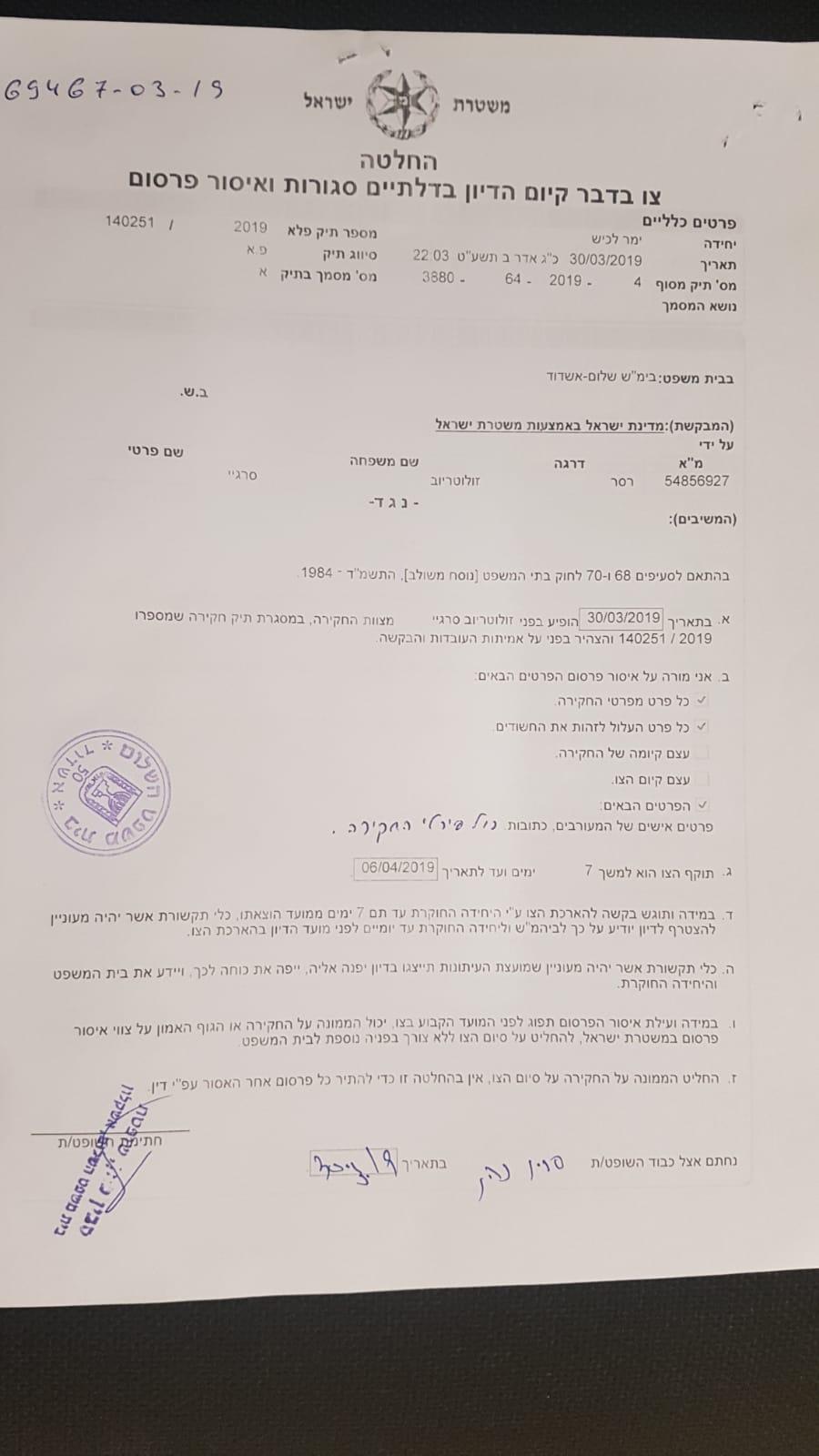 המשטרה הוציאה את הצו בבית המשפט באשדוד, בו ביקשה להטיל את הצו על איסור כל פרט מפרטי החקירה וכל פרט מזהה בקשר לחשודים. המשטרה עדיין לא הוציאה הודעה על מעצר חשודים בפרשה.
