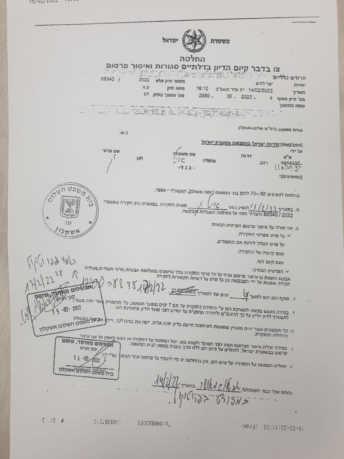 בימ"ש השלום הטיל צו איסור פרסום על חקירת הרצח שאירע בעיר אשקלון בתאריך 13.2.22, שמתנהלת בימ"ר לכיש, שמספרה 88340/2022.