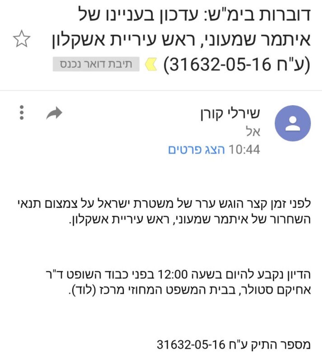 שופט בית המשפט המחוזי בלוד, אחיקם סטולר, היה אמור לדון היום בערעור המשטרה על ההקלה בתנאים, עליהם החליט השופט, אביב שרון, בשבוע שעבר. עו״ד אשר אוחיון, פרקליטו של שמעוני ביקש לדחות את הדיון למחר(שלישי), מאחר ואינו יכול להגיע בזמן לדיון. השופט, סטולר, קיבל את הבקשה וקבע דיון למחר ₪שלישי) בבית המשפט המחוזי בלוד השעה 09:00.