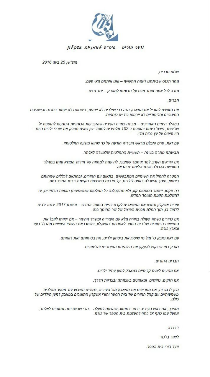 תגובת העירייה למכתב שמצורף כאן ויצא מועד ההורים של בית הספר: ההורים מלינים נגד העירייה על ההחלטה לפצל כיתות, על אף שהכתובת למחאה במקרה זה היא משרד החינוך בלבד, שכן זוהי הנחייה חד-משמעית שיצאה מטעמו. באשר לטענה על מחסור במבנים, ניתן מענה פיזי כבר השנה לגידול שחל במספר התלמידים עם הצבתם של שני מבנים יבילים נוספים, במקביל ישופצו ויותאמו חדרי השירותים, חדרי ספח, ויושלם מיגון בית הספר. כמו-כן, נקדם את התוכניות שכבר הוחלט עליהן לבניית בית ספר חדש לאומנויות. אם יש כאן מקום לדיון עקרוני על עתידו של בית הספר, הוא לא צריך להתנהל בהשבתות ואיומים, ובוודאי שלא על גבם של התלמידים.