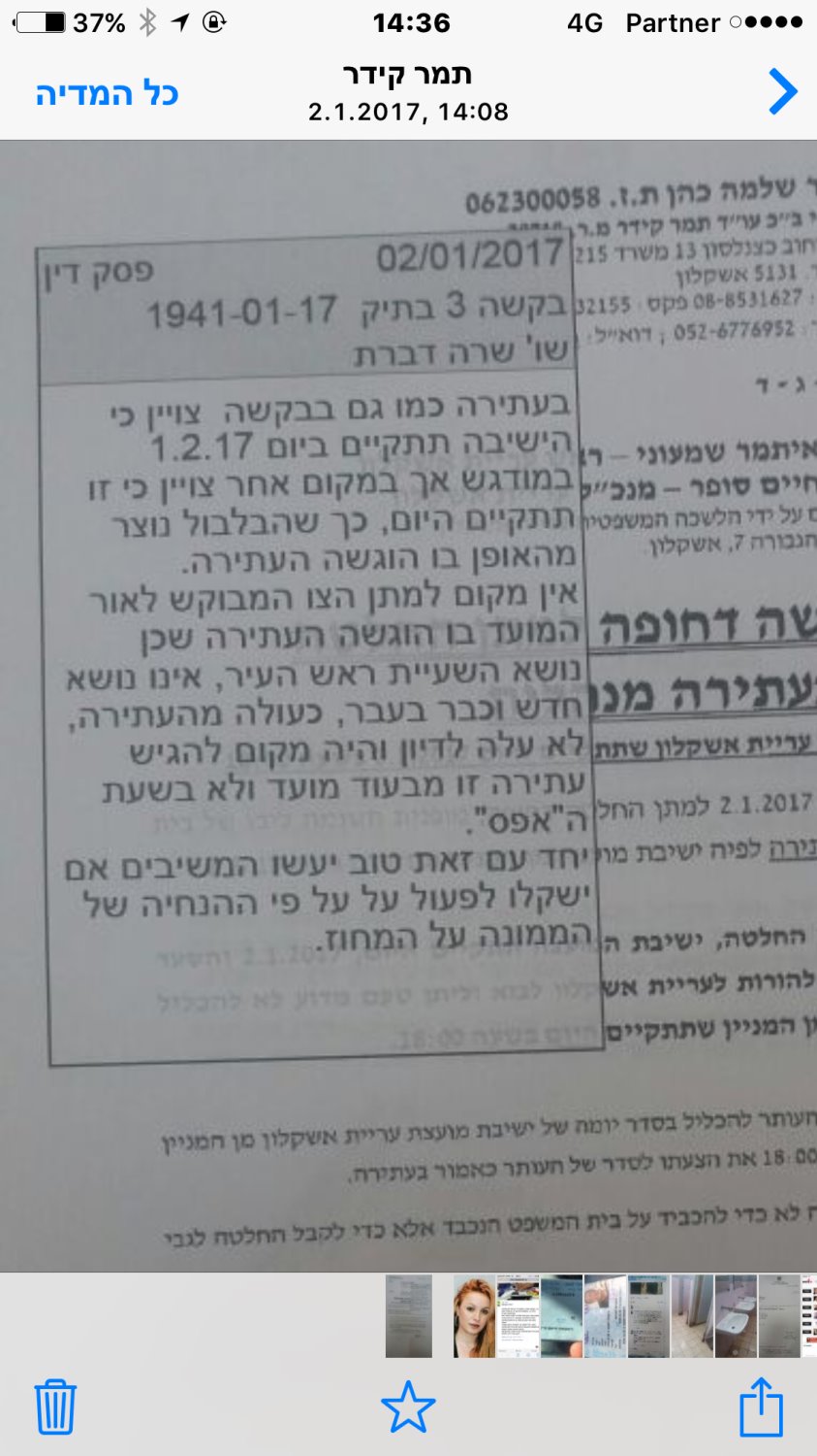 Hello בעקבות העתירה שהגישה סיעת ״אשקלון בתנופה״ באמצעות עו״ד תמר קידר, כנגד עיריית אשקלון בעיניין הצעה לסדר לכינוס ישיבת מועצה שלא מן המניין שתדון בהדחת איתמר שמעוני בגין התנהגות לא ראוייה, הוגש תיקון על ידי עורכת הדין, תמר קידר, לתיקון הבקשה ולקיים דיון דחוף, כבר אתמול. בית המשפט לא קיבל את הבקשה והשופטת, שרה דברת, כתבה בפסק הדין שעל המשיבה (עיריית אשקלון י.פ) לקבל את הנחיית משרד הפנים והממונה על המחוז במשרד הפנים, לקיים דיון בהצעה לסדר שהוגשה על ידי חבר המועצה, שלמה כהן. עורכת הדין, תמר קידר, מסרה שבמידה והנושא לא יעלה על סדר המועצה הערב (שני), היא תגיש מחר בבוקר, עתירה נוספת לבית המשפט שיאלץ את העירייה לקיים דיון בתוך שבועיים.