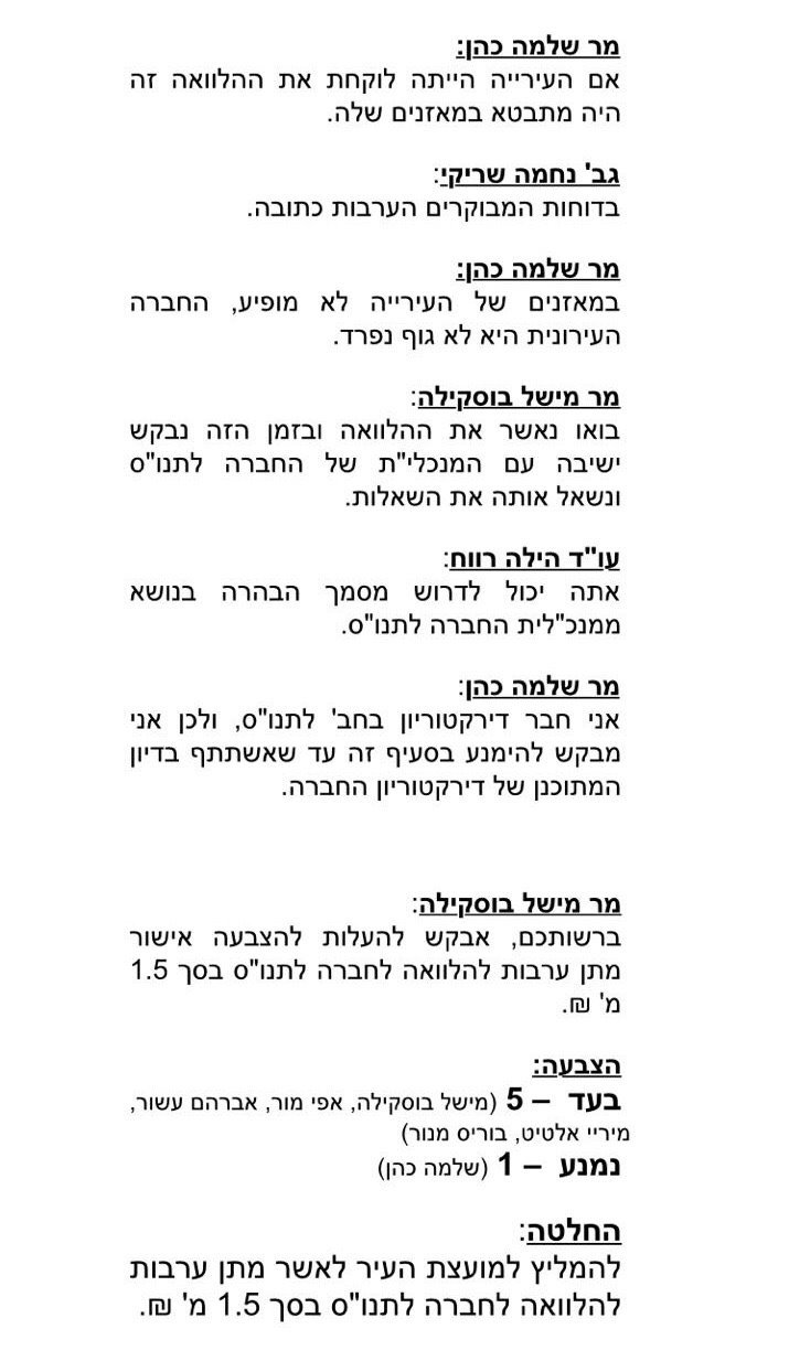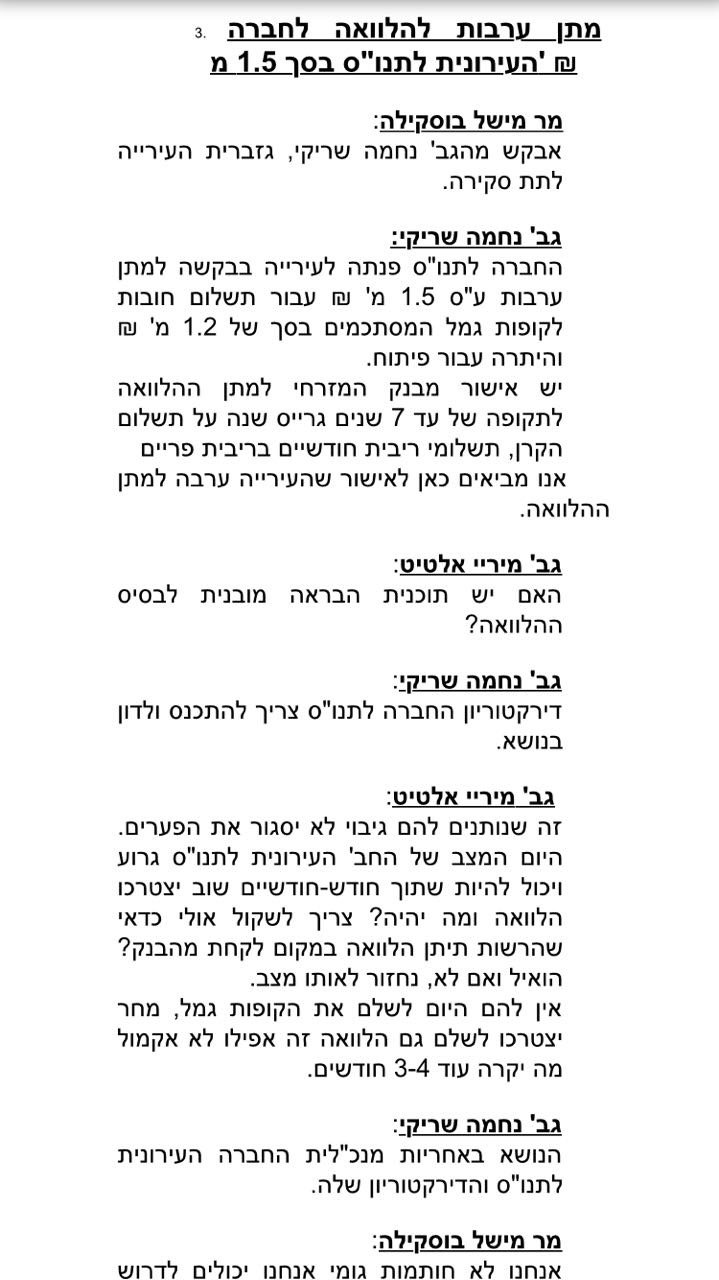 . אולם הלוואה: כבר אושרה לפני כחודשיים בישיבה בועדת הכספים ולכן כל מה שהיה היום היה הצגה. בוועדת כספים מיום 12.2.17 הצביעו חברי הוועדה לאשר את בקשת החברה העירונית לתנו"ס לתת ערבות של העירייה בסך 1.2 מיליון שח בעבור החובות לקופות הגמל של העובדים. בהודעה שהוציא היום רהע תומר גלם הוא מנחה את מנכל העירייה לדאוג להעברת הכספים תוך חודש מהיום. על פניו נראה שהגיע האביר והביא איתו את הגאולה לה מייחלים העובדים וכל שעומד לנגד עיניו הם העובדים ורווחתם. נשאלת השאלה, כיצד זה שהחלטת וועדת הכספים מתקבלת בפברואר 2017 ועד היום ההחלטה לא בוצעה בפועל. היכן האחריות של המנכל, הגזברית, היועצת המשפטית ושומרי הסף? מיום ההחלטה ועד לאיום ההשבתה של ההסתדרות חלפו להם בנחת 5 חודשי המתנה. היכן כספי ההלוואה, מה עלה בגורלם ומדוע הם לא הגיעו עד עצם היום הזה ליעודם? כמו כן, מדובר על רה ארגון מתוכנן בכל החברות שמוזכרות בוועדה מתי הוא אמור להתבצע? והאם בזמן שממתינים לכיסוי החוב בקרנות הפנסיה, נצברים חובות נוספים , מי ואיך יפרע אותם? לפניכם פרוטוקול וועדת הכספים שמאשר את מתן הערבות לבקשת החברה העירונית לתנו"ס. רה"ע הנחה את המנכל לקיים החלטה שהתקבלה לפני 5 חודשים ואף העניק לו 30 ימים נוספים לביצוע במקום 30 דקות. תוך שהוא שכח להנחות באותה הנשימה לבחון ללא דיחוי כמה חודשי פיגור ההלוואה מכסה ומהי תחזית החוב הצפוי עד סוף השנה.