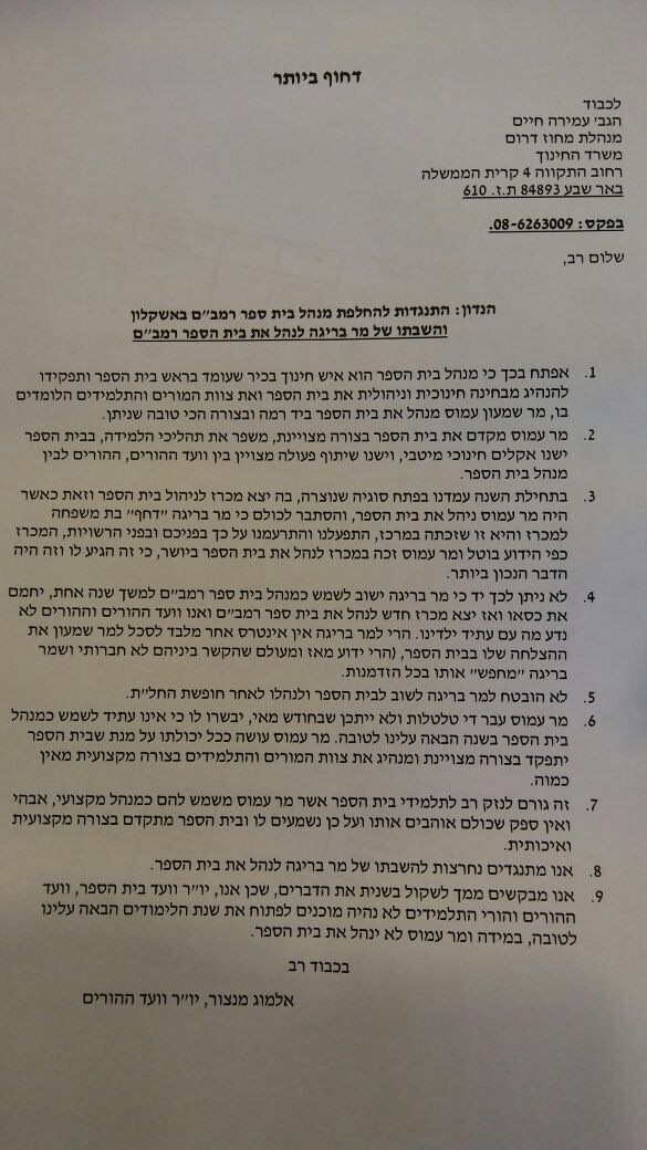 ״לא ניתן יד לחזרתו של מר בריגה לתפקיד מנהל בית הספר רמב״ם״ כך כותב במכתב ארוך ומפורט, אלמוג מנצור, יושב ראש ועד הורי בית הספר.