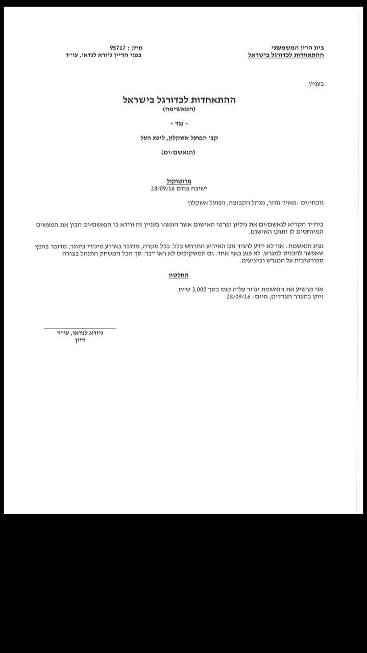 בית הדין המשמעתי של ההתאחדות לכדורגל בראשות הדיין עו"ד, גיורא לנדאו, הרשיע היום (רביעי) את קבוצת הפועל אשקלון בהשלכת גליל נייר לתחומי המגרש ופסק עליהם קנס  בגובה 3000 שקלים.