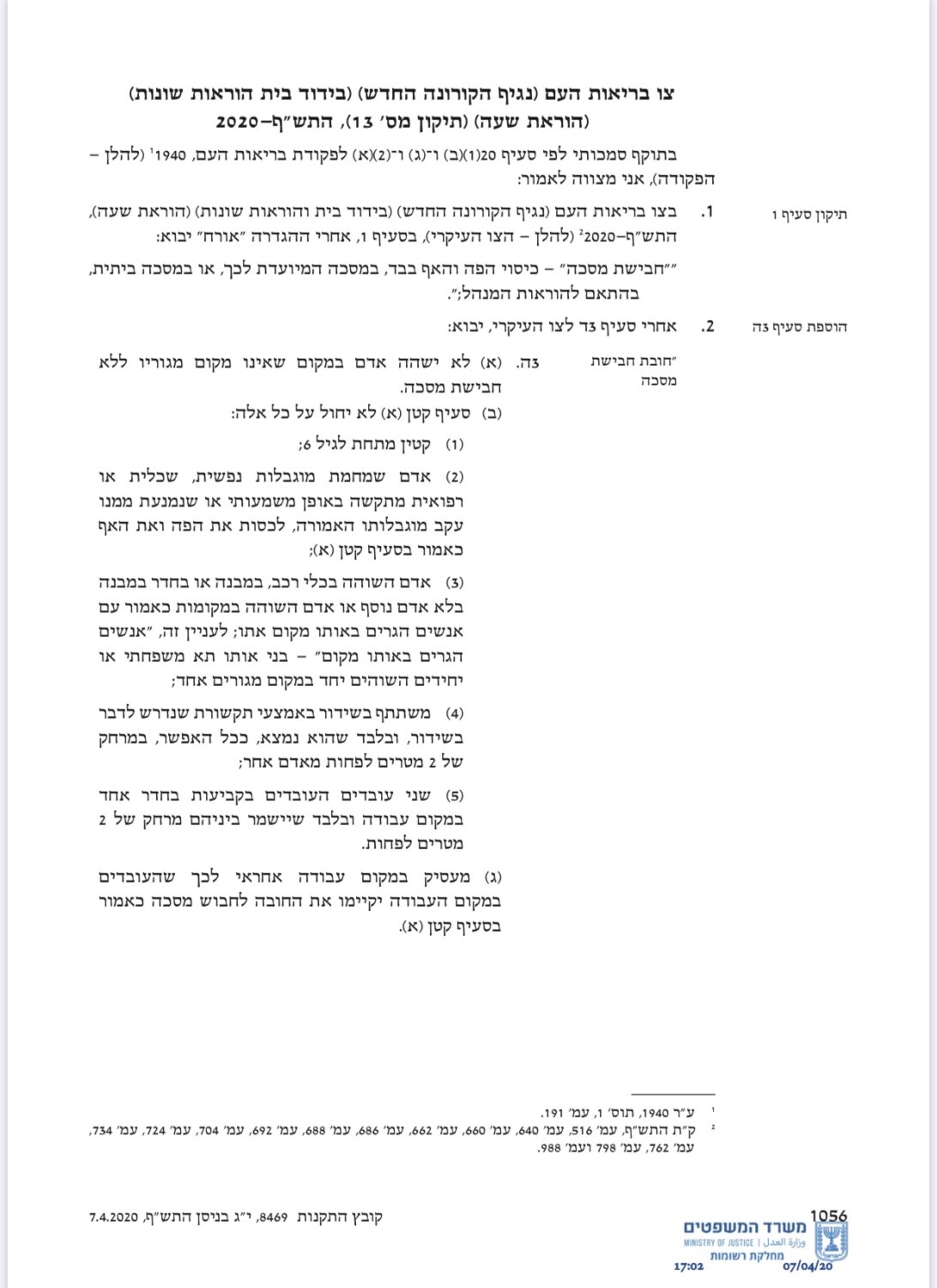 על פי צו בריאות העם שהוכנס לרשומות, לא ישהה אדם במקום שאינו מקום מגוריו ללא חבישת מסכה. כל ההגבלות בכתבה שלפניכם