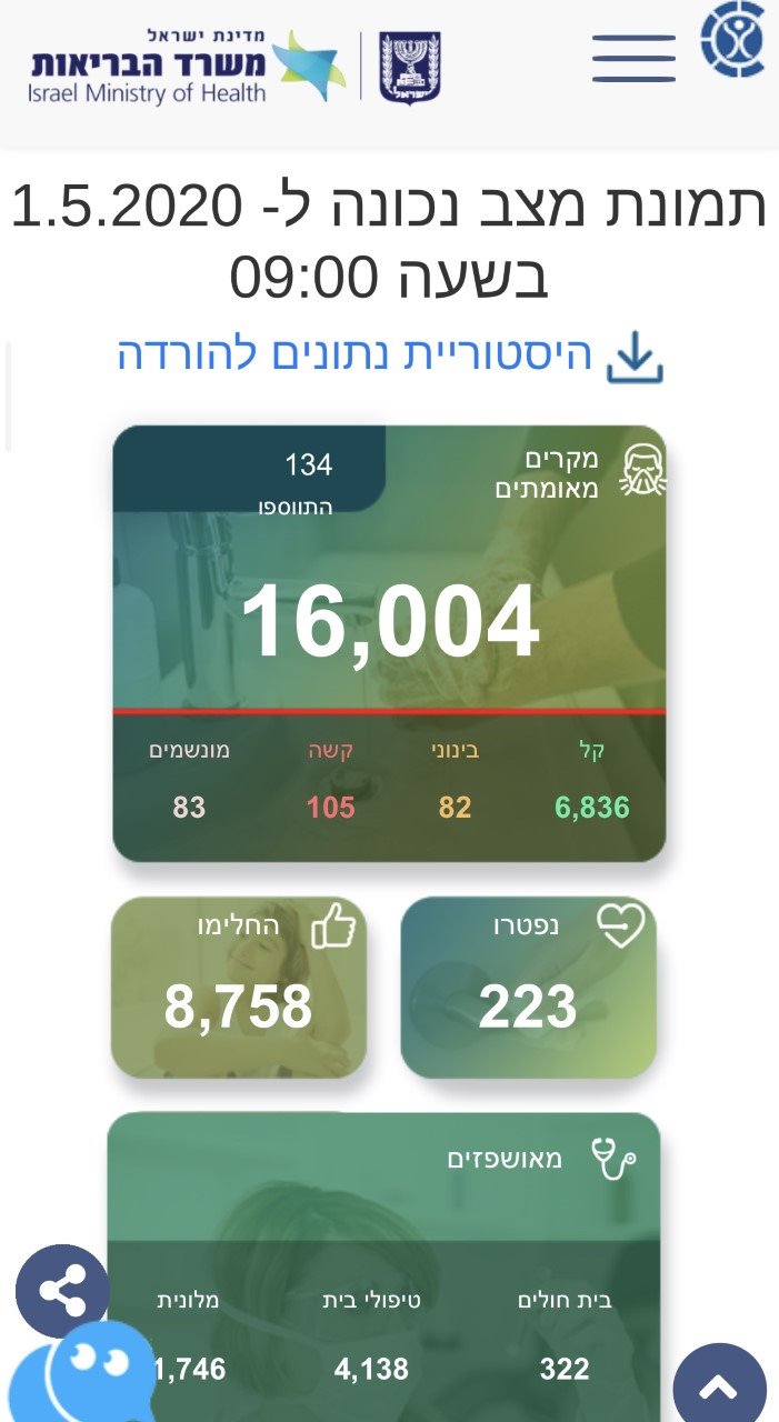 במדינה אושפזו 16,004 חולים, התווספו מאתמול 134 חולים. נפטרו עד כה 223, במצב בינוני - 82, במצב קשה - 105, מונשמים - 83. סך הכל החלימו מהמחלה 8,758.